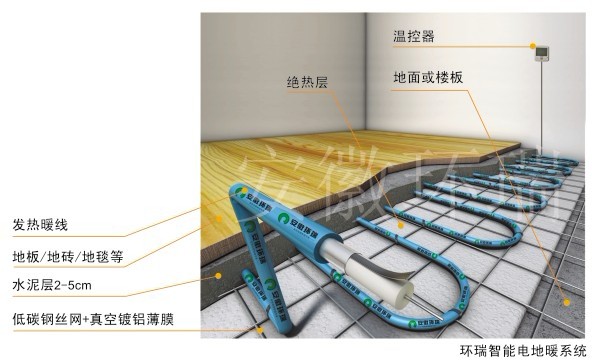 該系統是由發熱電纜和溫控器兩部分組成,發熱電纜鋪設于地面中,溫控器安裝于墻上,當室內環境溫度或地面溫度低于溫控器設定的溫度時,溫控器接通電源,發熱電纜通電后開始發熱升溫,發出的熱量被覆蓋的水泥層吸收,然后均勻加熱室內空氣,還有一部分熱量以遠紅外輻射的方式直接釋放到室內,使室內溫度分布更為合理。
